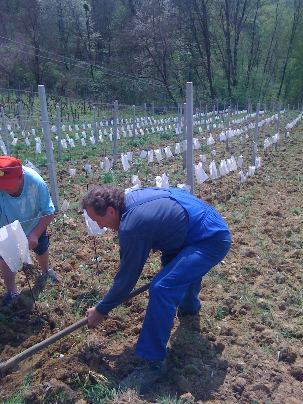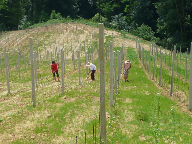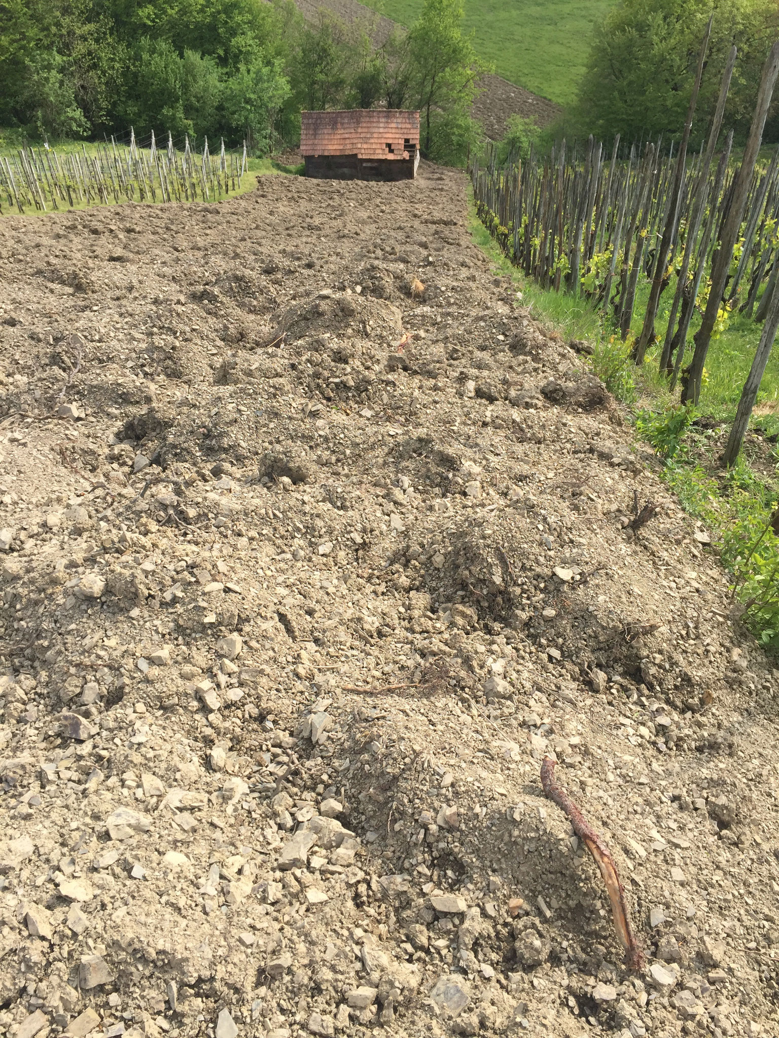 Ici vous pouvez voir des photos représentant de nouvelles plantations. Le Pinot Noir à Stara Vas et le Riesling à Buseca Vas. La position très raide du terrain (orienté au sud) rend le travail très difficile et les nouvelles plantations demandent aussi un grand effort pour le travail du terrain. Les premiers résultats des nouvelles plantations sont à prévoir pour 2020. Comment le Riesling se développera-t-il sur le terrain pierreux?